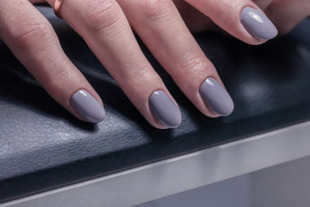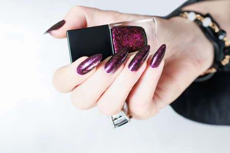 Female hand with long nails and purple plum manicure holds a bottle of nail polish