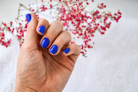 Hand with blue nails on dried flowers background. Female manicure. glamorous beautiful manicure. Winter or autumn manicure in blue. Fashionable Nail Gel Polish Color