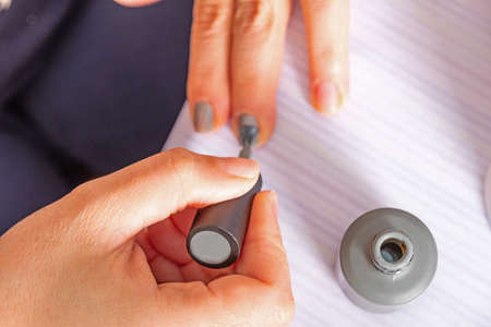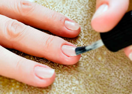 Hands of a female applying transparent nail polish on the nails with a black brush.