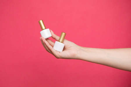 Females hand holding bottles nail polish on pink background.