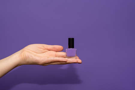 Female model hand hold purple nail polish on purple background. Nail polish demonstration concept. Nail design concept. copy space.