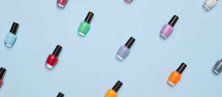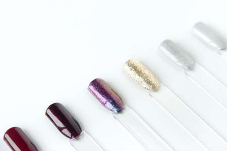 Multicolored nail Polish samples on a white background. Beauty banner. Trendy open composition, pattern. Nail varnish. Top view, flat lay, layout. Fashion, style. Summer manicure. Cosmetic products.