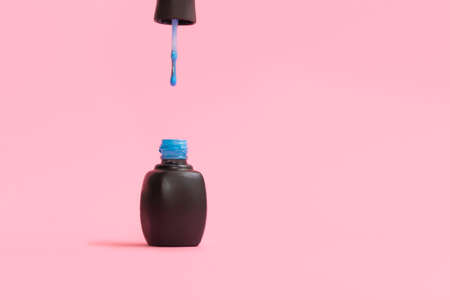 Open blue nail polish bottle on pastel pink background with copy space
