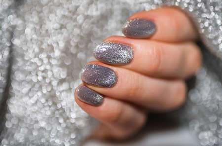 Nails Design. Hands With Bright Silver Christmas Manicure. Close Up Of Female Hands. Art Nail.