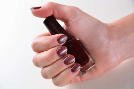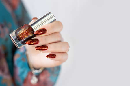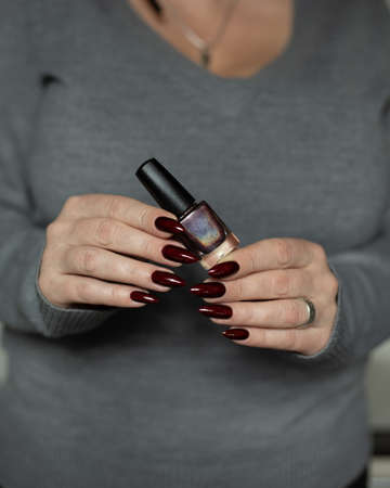 Female hand with long nails and golden brown maroon, manicure holds a bottle of nail polish