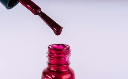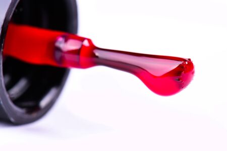 Close up of brilliant nail polish on isolated white background. Bright red lacquer for manicure