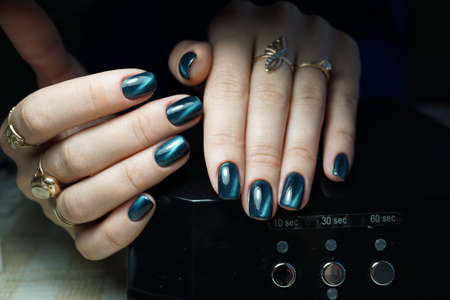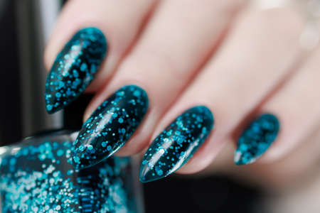 Female hand with long nails and dark blue teal manicure holds a bottle of nail polish