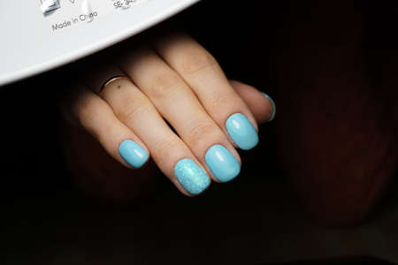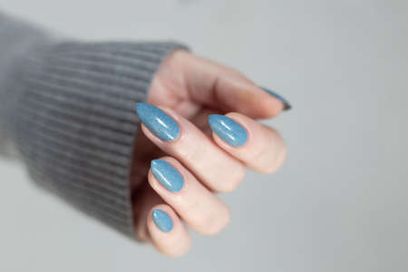 Female hand with beautiful manicure - turquoise, mint blue nails on blue blurred background. Nail care concept