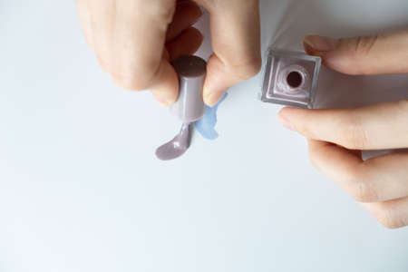 Woman with brown autumn nails polish color holding a little bottle on white background. Manicure and beauty concept