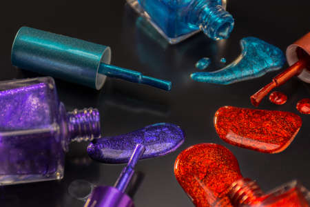 Nail polish. Female hands make strokes of varnishes of different colors. view from above. Mix with sparkles.
