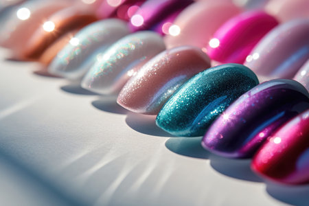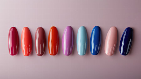 Nail polish samples in different bright colors. Colorful nail lacquer manicure swatches. Top view of nail art samples palette. Free copy space.