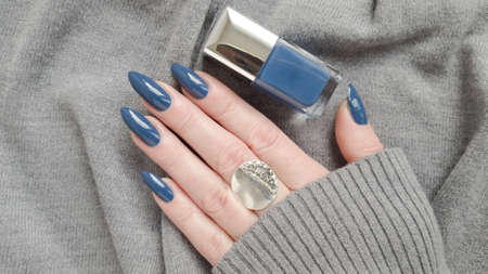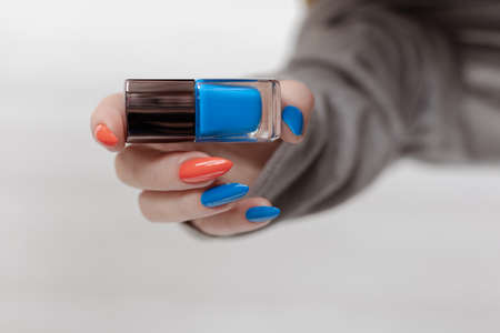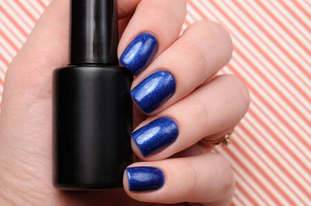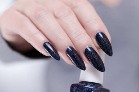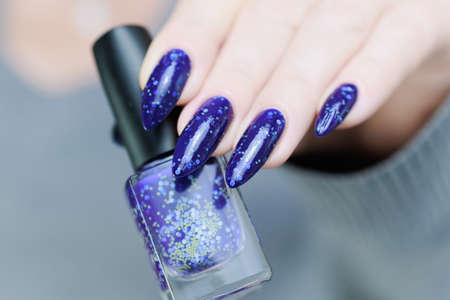 Female hand with long nails and purple blue manicure holds a bottle of nail polish