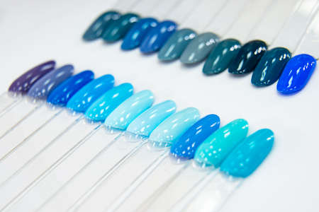 Nail Care And Manicure concept. Multicolor Nail Polish palette for Client's Nails choise. Woman In Beauty Salon. Copyspace for text . variety of choice of color and design gel varnish. gel polish
