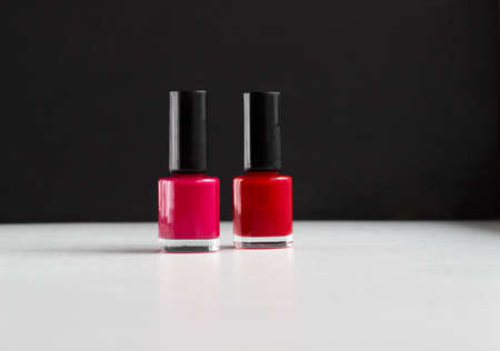 Red and pink nail polish bottles on balck and white background