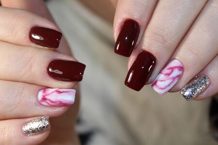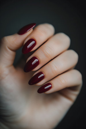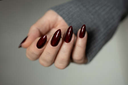 woman hand with a beautiful manicure in deep maroon shade. High quality photo