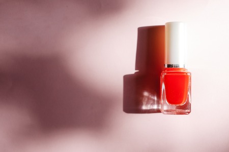Woman hand hold orange lacquer on orange pink background. Female hand with orange nail.