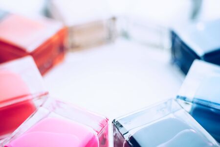 Nail polish samples in different bright colors. Colorful nail lacquer manicure swatches. Top view of nail art samples palette.