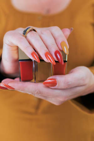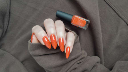 Female hand with long nails and orange ginger manicure holds a bottle of nail polish