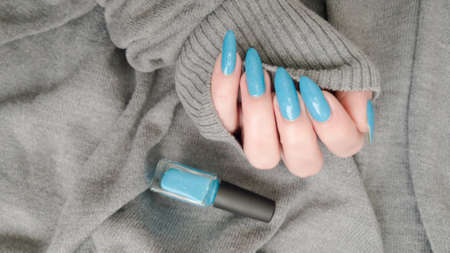 Female hand with long nails and light blue turquoise manicure with bottles of nail polish