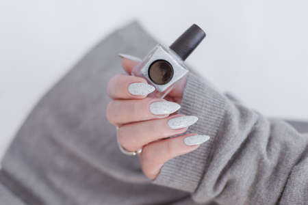 Female hand in gray knitted sweater with beautiful manicure - green glittered nails. Nail care concept