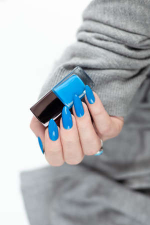 Woman's beautiful hand with long nails and blue manicure with bottles of nail polish