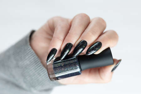 Female hand with long nails and black manicure holds a bottle of nail polish
