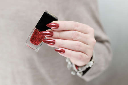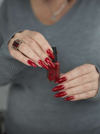 Female hand with long nails and a red manicure holds a bottle of nail polish