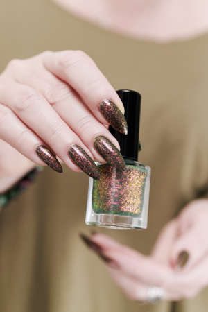 Female hand with long nails and a bottle of brown green nail polish