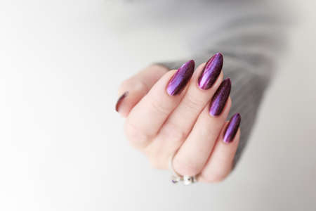 Female hand with purple violet long nails