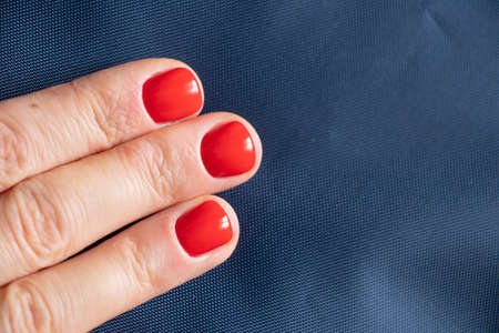 female hands with red manicure close up on isolated colored background