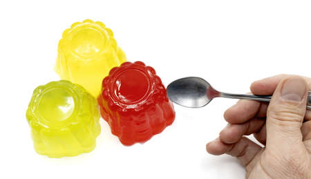 Tasting some delicious jellies of different flavors, strawberry, lime and lemon with a spoon, white background