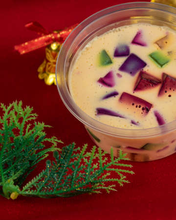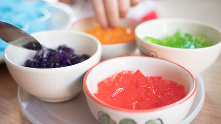 The colored pipo jelly cut into small pieces in a small cup is ready to make desserts for the kids.