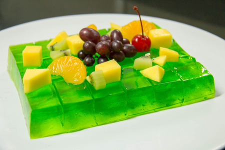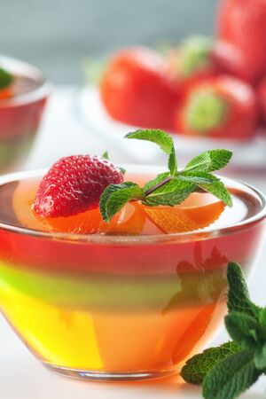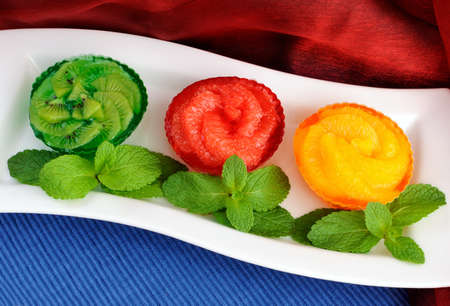 Jelly dessert of fresh fruit oranges, grapefruit, kiwi with mint