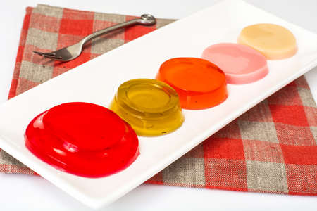 three fruit jelly kivi mandarin apple on white background located in diagonal