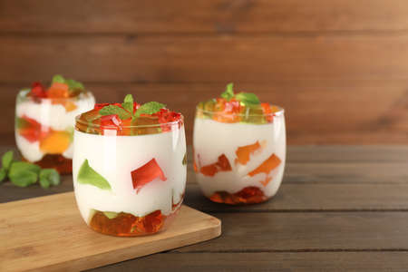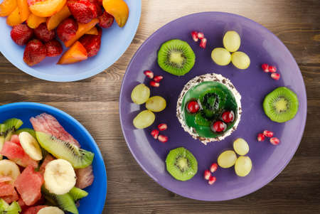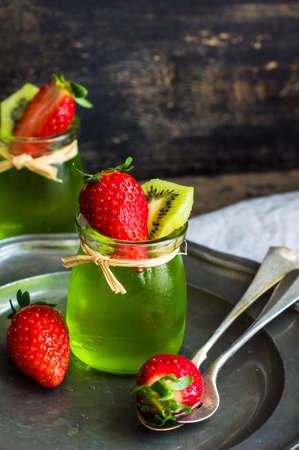 Jelly kiwi and strawberry desset on rustic table with copyspace
