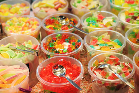 Colorful jellies in plastic bowls arranged in a pile and photographed from above (Selective Focus, Focus on the rim of the left red jelly)