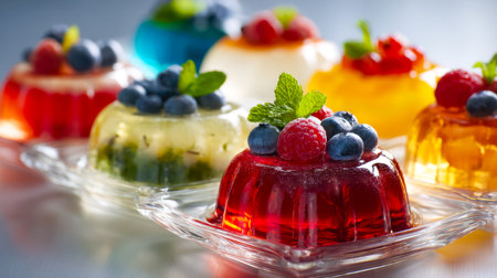 Vibrant jelly treats in a spectrum of hues, adorned with ripe berries and fragrant mint, creating an inviting and refreshing summer-inspired dessert display.