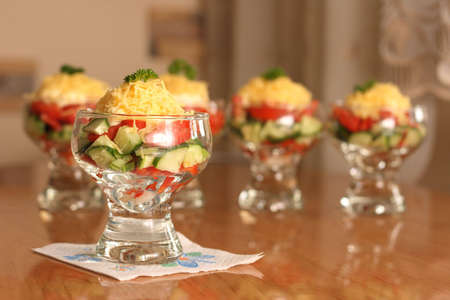 Salad of vegetables in a small glass. Put on a line in the buffet.