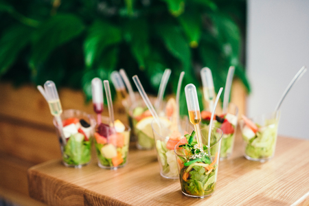 Mini fresh salads with sauce. Catering - served table with appetizers. Selective focus