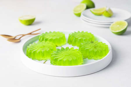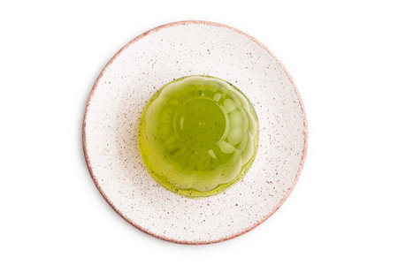 Mint green jelly isolated on white background. top view, flat lay, close up.