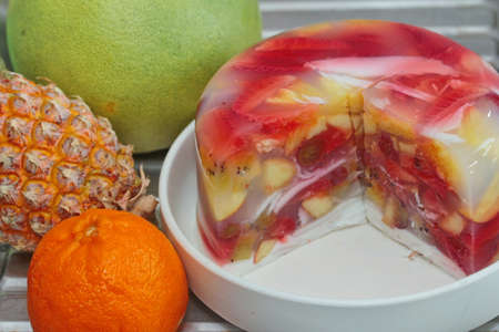 Close view of a colorful jelly cake with a variety of fruits in a white plate