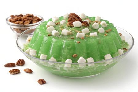 a delicious lime gelatin salad with marshmallows and pecans in a clear bowl. 83 characters