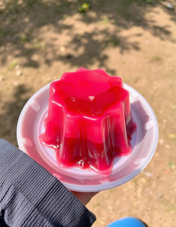 A bright and cheerful jelly dessert shaped like a cute character, sitting on a decorative plate. Perfect for adding fun to any gathering or celebration.