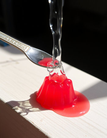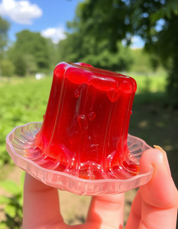A dynamic image of a spoon scooping up a luscious, wobbly jelly from a dessert cup, with the vibrant colors and translucent texture clearly visible.