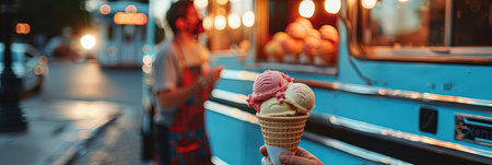Ice cream cone with a pink ice cream truck or van in the background.
