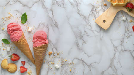 Top view of summer dessert with strawberry flavour ice-cream cones, topping and copy space on marble desk background