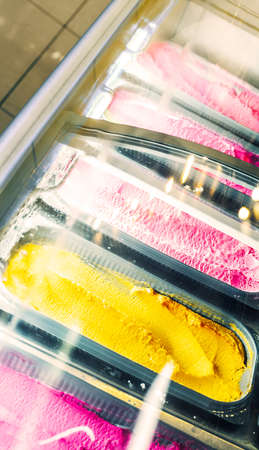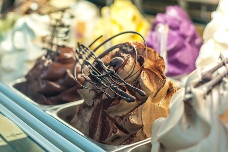 Showcase with colorful fruit ice cream, chocolate, vanilla. Ice cream shop. Sweets.