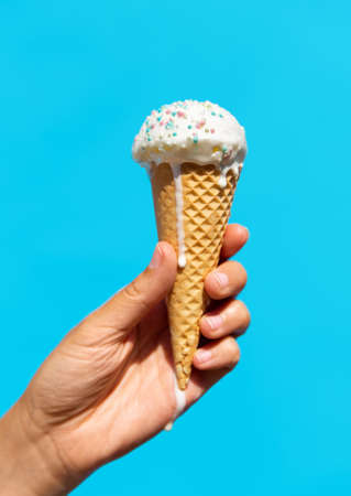 Womans hand holding ice cream in waffle cone.