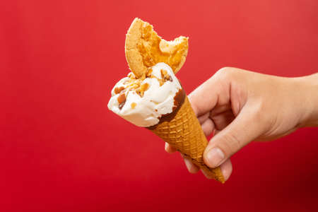 hand holding a fresh ice cream cone with piece of cookie with a bite on red