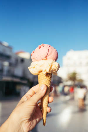 ice cream in waffle cone on blurred background of city street.